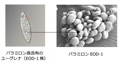 パラミロンは、微細藻類であるユーグレナのみが細胞内貯蔵物質として生成する高密度の不溶性食物繊維だ。「パラミロン EOD-1」とは、ユーグレナの中でも(株)神鋼環境ソリューションが特許を取得している新規株「ユーグレナ EOD-1株」に含まれるパラミロンのこと。