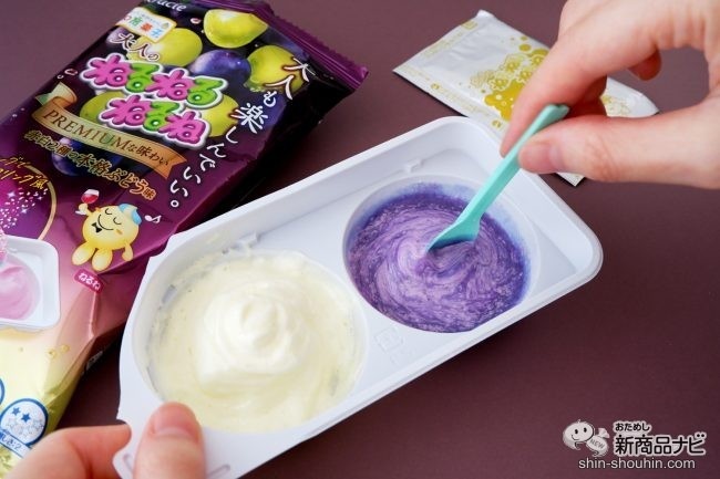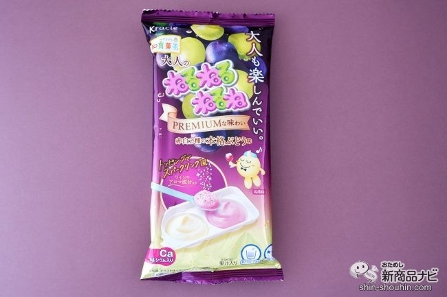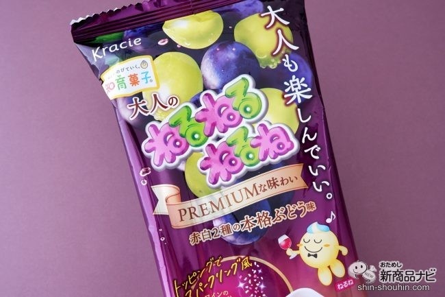 「大人も楽しんでいい。」のキャッチフレーズがグっとくる。プレミアムな味わいということで、赤と白2種類の本格ぶどう味が楽しめる。ワインのアロマ成分と果汁入り。赤はコンコード果汁、白はシャルドネ果汁を使うこだわり。ソムリエが選んだねるねるねるねに合うワインのアロマ成分が使われているのだとか。もちろん製品にアルコールは含まれていないので、親子でも楽しめる商品仕様となっている。