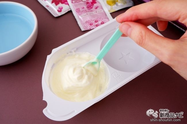 「白ねるねる1ばん」の粉と、水を入れてスプーンでよく混ぜる。