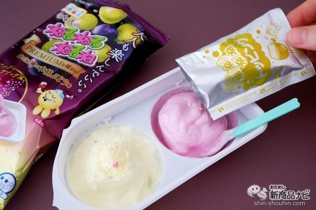 シャルドネ種白ワイン、コンコード種赤ワイン、2種類の本格的なぶどうの味わいのねるねるねるね。甘いぶどうの味わいかな? と思っていたのだが、思っている以上に赤ワインと白ワインの味わいが表現されていておもしろい。トッピングのシュワシュワ感と、ふわふわの食感が口の中で溶けていく。