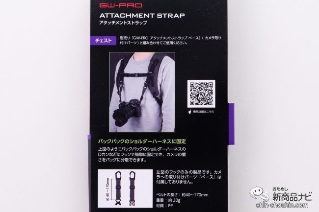 『ハクバ GW-PRO アタッチメントストラップ チェスト』(WEB販売価格 税込1,290円・発売中)はバックパックのショルダーハーネスに取り付けるためのチェストとなっている。チェストのみの商品となっており、バックパックにDリングなどフックを取り付ける構造がないと使えない点はご注意を。