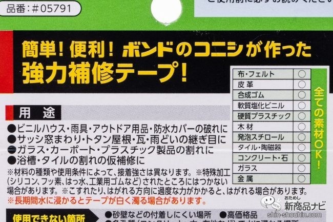 さらに、時間が経つほどに粘着力が増すから、雨具やアウトドア用品をはじめ、ガラスやプラスチック製品の割れ、浴槽やタイル割れの仮補修など、幅広い用途に使うことができるのだ。