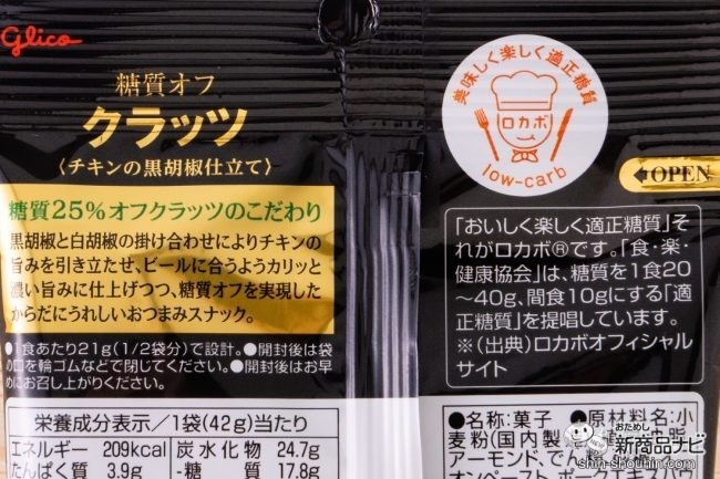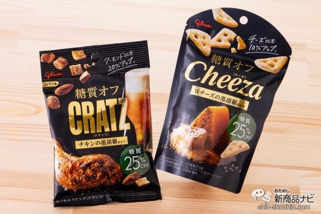 おつまみスナックとして人気の「クラッツ」と「チーザ」ブランドから『糖質オフ クラッツ<チキンの黒胡椒仕立て>/チーザ<Wチーズの黒胡椒仕立て>』が新登場。食感や旨味はそのままに、通常品よりも糖質を25%カットしたことで気兼ねなく食べられるようになったヘルシースナックだ。でも、糖質が減ると味がそっけなくなるのが普通だ。そこのところを確認してみよう。