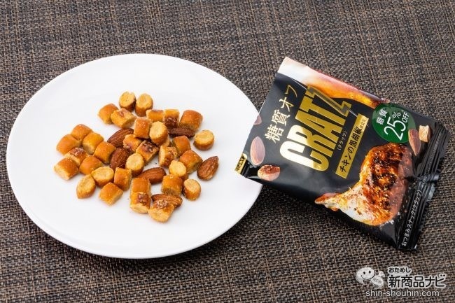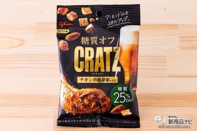 まずは『糖質オフ クラッツ<チキンの黒胡椒仕立て>』(42g・実勢価格 税込151円)から。「クラッツ<ペッパーベーコン>」よりもアーモンドの比率を20%アップし、さらに黒胡椒と白胡椒を掛け合わせてチキンの旨味を引き立てることで、味わいの変化を最小限にとどめている。