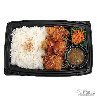塩味で下味をつけて揚げた鶏の唐揚げに、甘辛特製たれをかけた唐揚げ弁当。長葱を加えたもう1つの特製たれ付きで味変も可能。