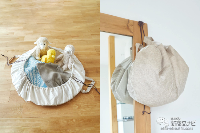 マット部分に物を置いたまま紐を結ぶだけで簡単に収納できるアイテム。取っ手が付いているので持ち運びが楽々でき、フックに掛けて収納することが可能。インテリアに馴染みやすいベージュカラー。