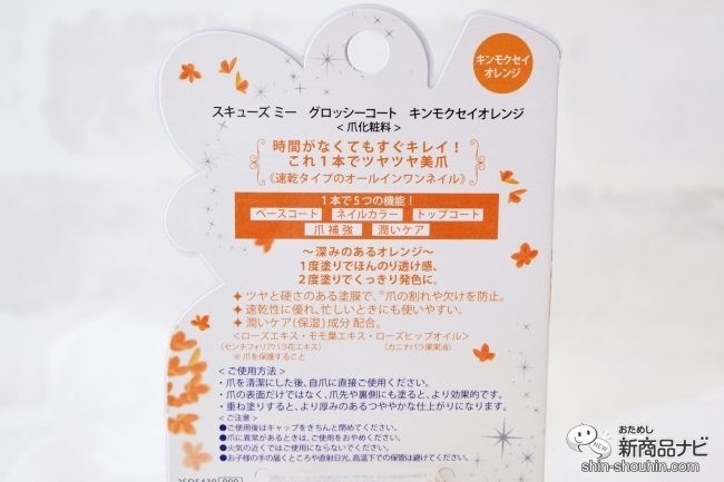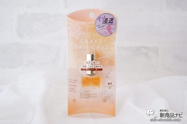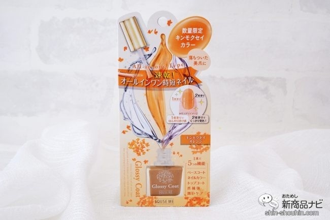 どちらもキンモクセイをフィーチャーした限定デザイン。『グロッシーコート キンモクセイオレンジ』と『シェイクネイルケアオイル K』はバラエティショップ限定で発売。