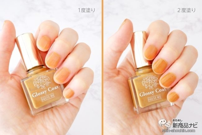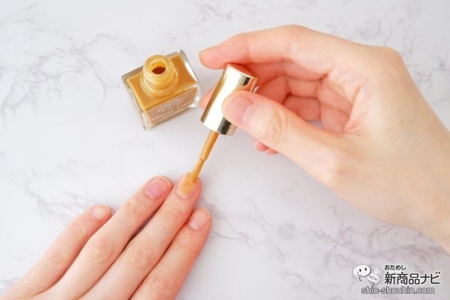 ※仕上がりイメージ1度塗りだと肌になじむナチュラルな仕上がり。2度塗りは指先をより華やかに、カラーがはっきりとした仕上がり。どちらも表面はちゅるんとした艶があり、品のある印象を与えてくれる。