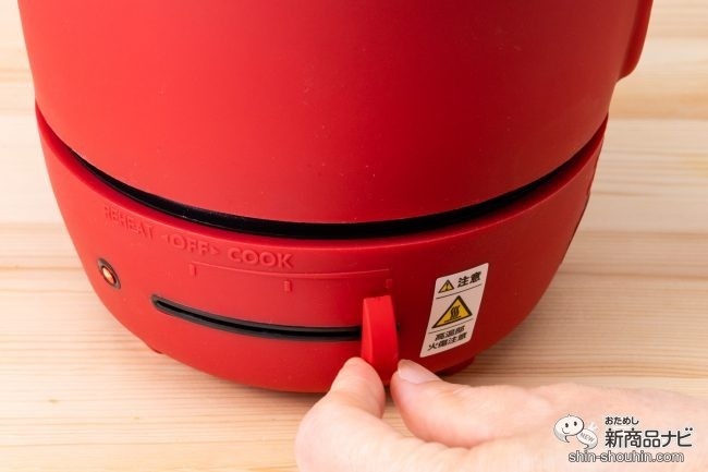 調理鍋の表面を触ってみると、シリコン製なのだろうか、しっとりとしてやわらかい。次は、温度調節つまみを【COOK】方向へ右にスライド。