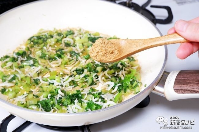 ごま油でしらすと小松菜を炒め、日本酒を加えた後に『だし香る ごま和えの素』を加えて全体を混ぜ合わせる。他に調味料は不要なので簡単。
