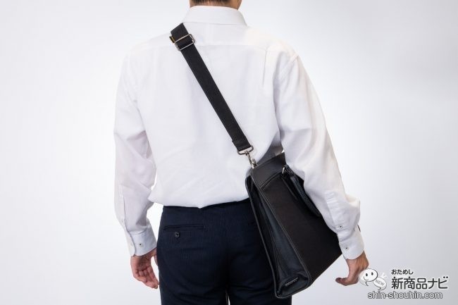 実際に肩からかけてみると、ガッチリと肩にフィットするので、安心感がある。移動中にビジネスバッグの中から何かを取り出そうとしても、ズレないため中身を確認することに集中できる点もポイントが高い。