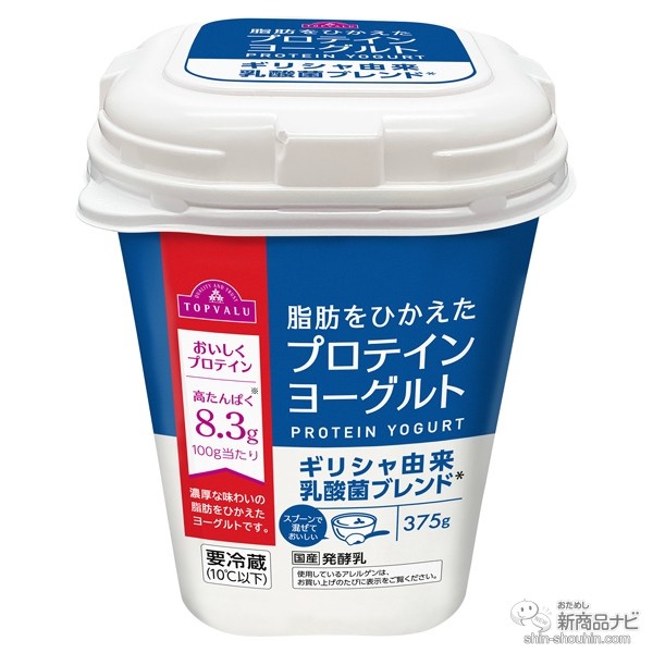 ギリシャ由来の乳酸菌をブレンドし、脂肪をひかえたプロテインヨーグルト。100gあたり、たんぱく質8.3g、脂質0.2g。