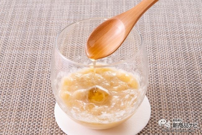 これは子どもたちが大好きなバナナとも相性が良さそう…! さっそく潰したバナナに垂らしてみる。