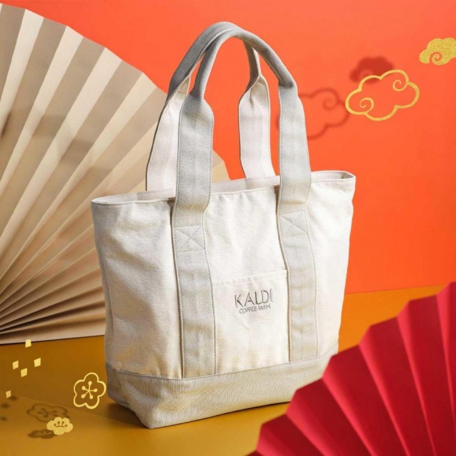丈夫なキャンバス生地のトートバッグをはじめ、福袋限定のオリジナル商品や、和食材ブランド「もへじ」の干支柄エコバッグなど、カルディの人気商品が20点前後セットになっています。
