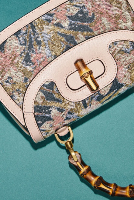 発表されたのは、西陣織のもっとも歴史ある老舗のひとつ、HOSOO(細尾)とのスペシャルなコラボレーションによる「グッチ バンブー 1947」と「グッチ ダイアナ」の限定バッグで、西陣の地で伝統の技を受け継ぐ職人たちが織り上げたテキスタイルを用い、フィレンツェのグッチの職人たちがグッチを象徴するバンブーハンドルのハンドバッグとなっています。