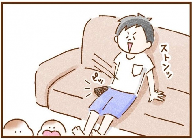 するとそこにパパが現れ、ソファーに腰を下ろす。しかし、ちょうど座った所にはテレビのリモコンが。お尻でボタンを押してしまったのか「ピッ」と音がして......。