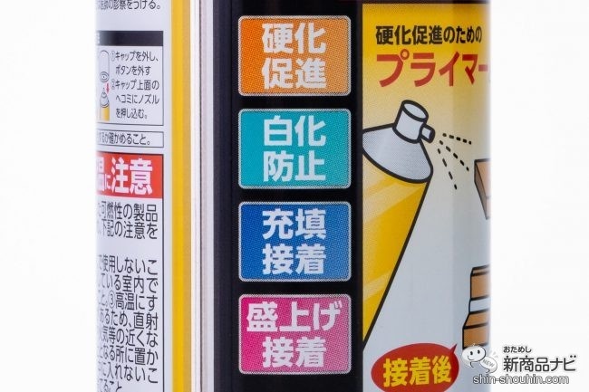 また、もう1つの瞬間接着剤あるあるといえば、接着跡が白くなること。これは接着剤の成分が硬化する前に蒸発してしまう事に起因して起こる現象なのだが、早く硬化させることで抑制できると言われている。つまり、硬化速度を速めてくれる『ボンド アロンアルフア(R)専用硬化促進剤』を使えば、白化現象を防げるはず。