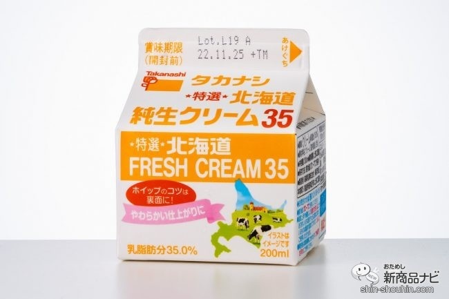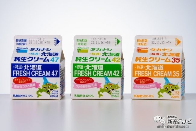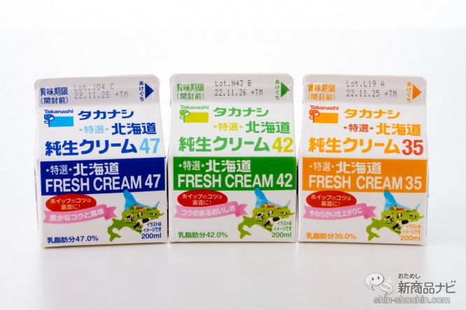 同社が製造する『タカナシ特選北海道純生クリーム』(200ml・希望小売価格 税込394円~497円・発売中)は、乳脂肪分が異なる3種類を展開。商品名の35.42.47の数字は乳脂肪分の%を表しているそうで、それぞれに風味が異なり、好みや用途に合わせて選べるのが魅力だ。