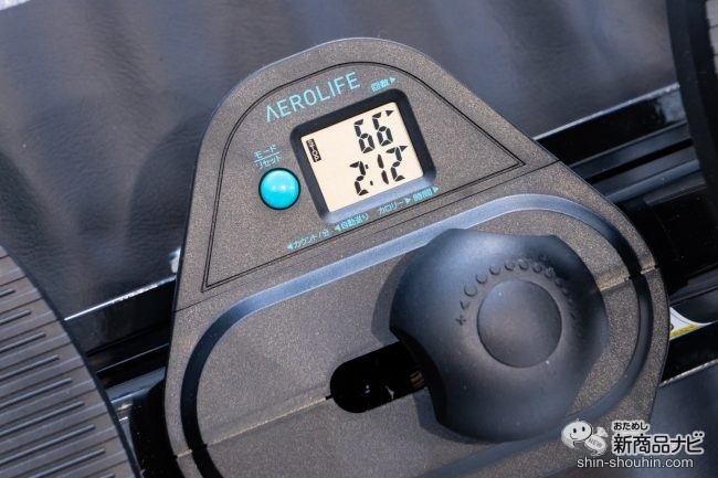 真ん中に付いているのは、負荷調節ダイヤル。ダイヤルを+方向に回すと負荷が強くなり、-方向に回すと負荷が弱くなる。負荷調整式のため、一人一人の体力に合わせて運動ができる。