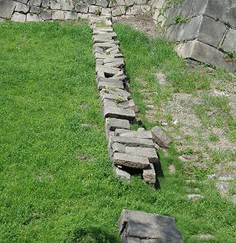 空堀と水堀の境目に不思議な石組。高さ1.5m、幅2m程度の石組みが空堀の外側と内側をつないでいます。内部は大人が背をかがめてやっと通れるくらいの空洞になっており、何のために造られたかは不明です。真田幸村が掘った抜け穴と言う説もあります。