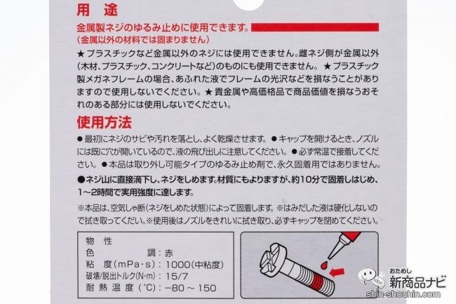 ネジを取り出し、ネジ山の部分にパッケージ裏面の位置を参照に塗って使用する。金属製のネジのみ使用できる。ワッシャーやダブルナット、割ピンがない場合のネジ止め補強にも使える。