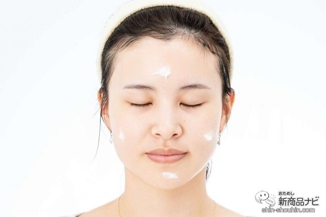 まずはパール大のクリームを手にとり、おでこ、両頬、あごの4か所に分けてのせる。