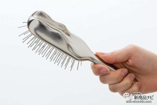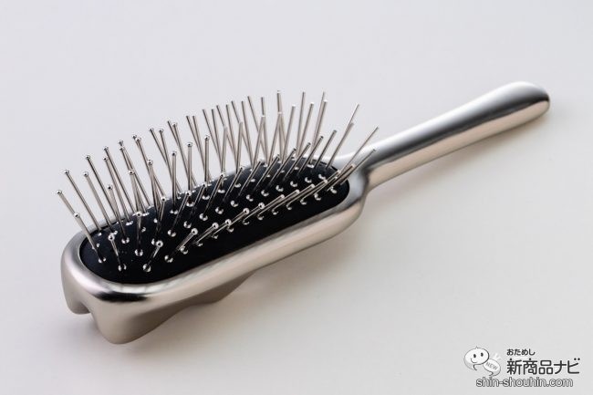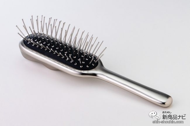 スタイリッシュなシルバーのボディは、手に持つと一般的なヘアブラシよりもズシッとした重さがある。柄は細くて握りやすい。