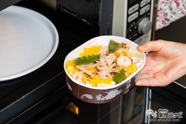 ちらし寿司は、外側の袋から取り出して温める。600Wで3分加熱した後、透明フィルムを少し開封して室温に20~30分置いて冷ます工程が必要。