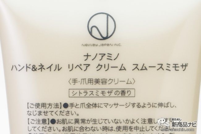 シャンプーやトリートメント等のヘアケア商品を中心に美容アイテムの開発・販売を行うニューウェイジャパン(東京都)。サロン向けの専売品も多く展開している。今回新たに登場したのは、手肌の乾燥が気になる人におすすめの『ナノアミノ ハンド&ネイル リペアクリーム スムースミモザ』(内容量70g・販売価格 税込・2,090円・発売中)。高い保水力を持つアイテムで、手肌にうるおいをしっかり与えてくれる。さらにナノ化されたセラミドがうるおいを保ち、乾燥知らずの手肌へと導いてくれる。