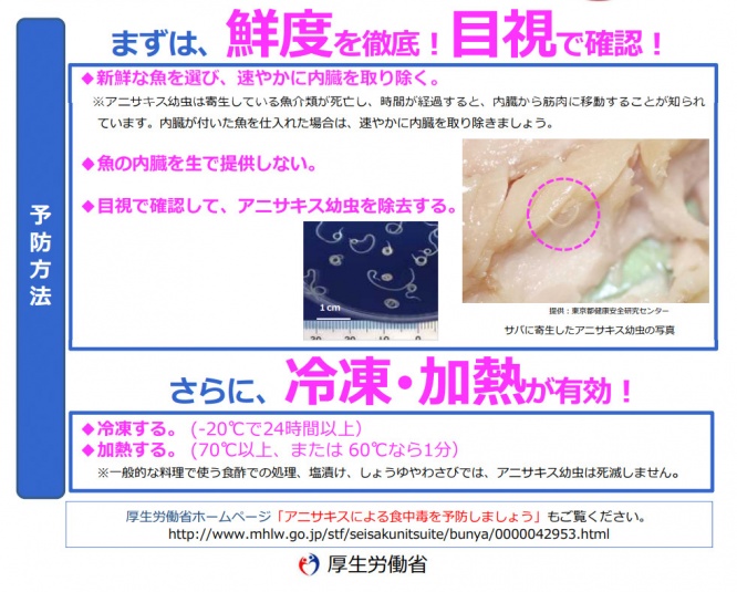 まずは、鮮度を徹底し、目視で確認。さらに、冷凍、加熱が有効だと呼びかけている。