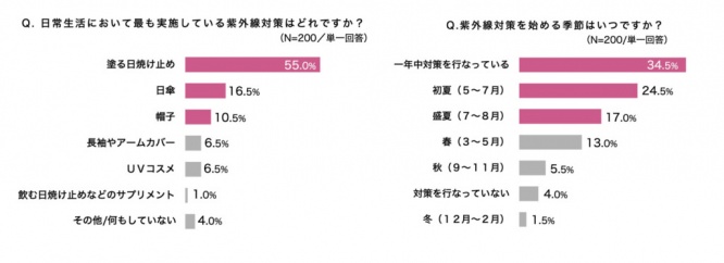 さらに、「紫外線対策を始める季節は?」の質問に対して、最も回答が多かったのは「1年中対策を⾏っている」(34.5%)という結果になった。