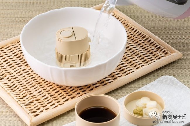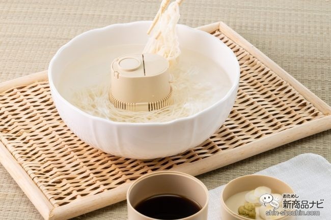 フタを開けると『流しそうめんpocket』の本体がお目見え。この大きさで、そうめんを流せるほどの水流が生まれるとは驚きだ。本体が入っていたケースは、深い方をそばちょことして、浅い方を薬味入れとして活用できる。ケースまで有効活用するアイディアはさすが!