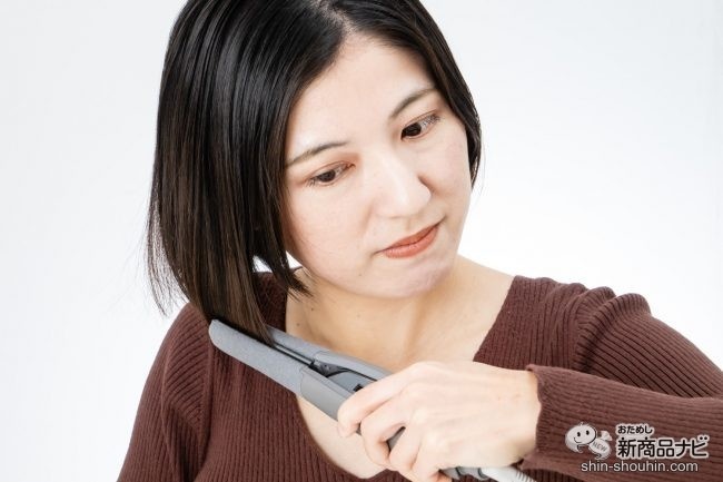 髪のクセに合わせ、数回繰り返し髪の根元から毛先に向かってゆっくりとすべらせていく。プレートは髪の流れに沿って前後左右に傾いて髪に密着するため、軽い力でもしっかりとキャッチできた。しかもプレートのすべりがよく、髪が引っかかることがないため髪にやさしくスムーズな使用感だ。