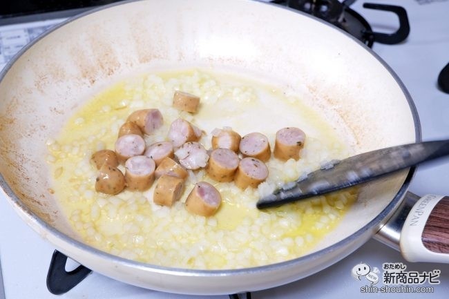 続いて具材を炒める。ウインナーが入ると肉の旨味で味に深みが増していく。