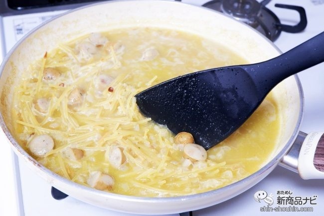 スープを注いで4分30秒ほど加熱。パスタが魚介の旨みをどんどん吸いこんでいく。