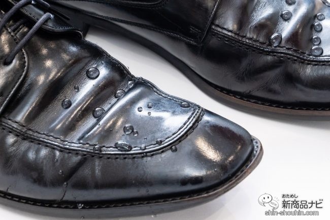 スプレー後に水を革靴にかけてみる。すると、はっ水効果で水が靴に染みこまずに水滴となった。浸透する気配はなく、足先を振れば水も弾けるように落ちていく。
