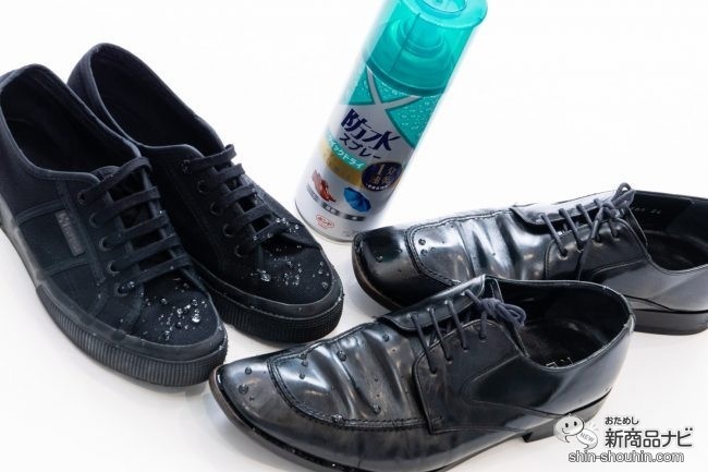 革靴とスニーカー、両方で十分な防水効果を実感できた。本格的な梅雨を迎える前に、日用品のさまざまなアイテムをスピーディに防水できる『防水スプレークイックドライ』は、一家に一本持っておきたい!