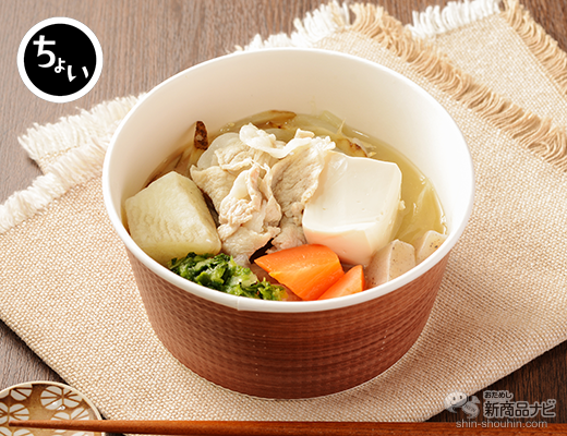 具材に、豚もも肉、豆腐、じゃがいも、人参、玉ねぎ、大根、ごぼう、こんにゃくを使った豚汁。豚肉と野菜の味を活かした、ご飯が欲しくなる仕立てという。