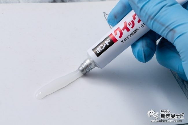 まずは紙の上などにA剤を絞り出す。接着剤が手に付着してしまうとかぶれる恐れがあるので、手袋などを着用し、付着した場合はすぐに拭き取り石鹸で水洗いしよう。