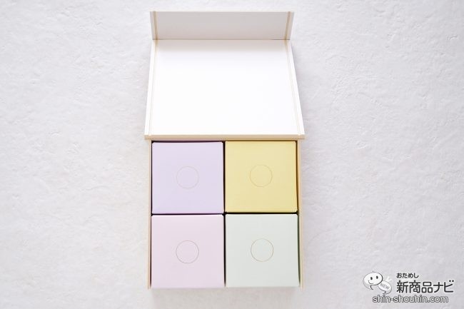 真っ白な木箱にパステルカラーの小箱が並んでおり、ギフトとしても喜んでもらえること間違いなしだ。