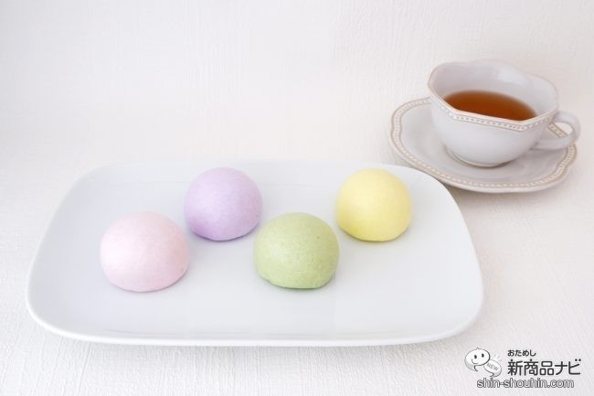 中は2重餡になっていて、中心には塩瀬総本家のこしあんを使用。最初はくだものの味を楽しみ、後味にこしあんの味わいを楽しめるグラデーションとなっている。味は赤が福岡あまおう、緑が茨城青肉メロン、紫が栃木巨峰、黄色が瀬戸内レモン。