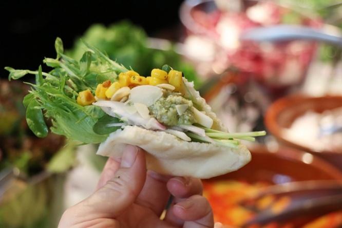 ピタサンドステーションでは、もちもちなピタパンに色とりどりのフムス、新鮮な野菜やドライグリーンカレーを挟んで、オリジナルピタサンドを作れます。