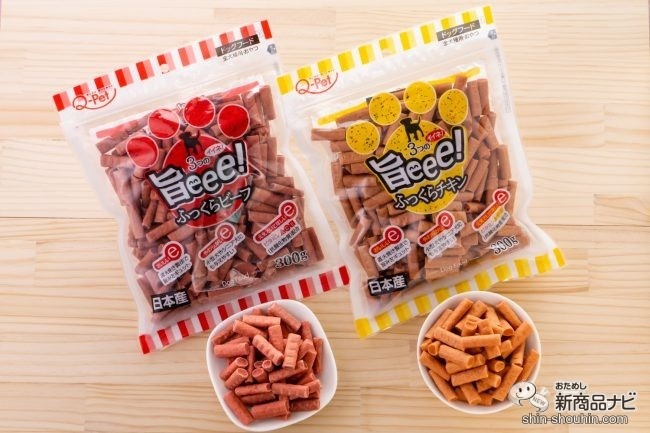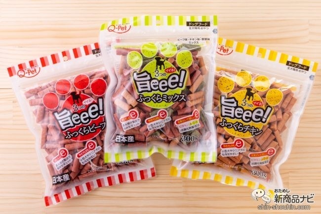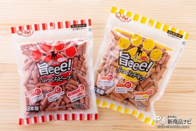 『旨eee!(うまいー)』(全3種・100g・参考小売価格 税込240円/300g・参考小売価格 税込450円)は、「おいしいおやつを与えたい」「安心して与えたい」「元気でいてほしい」という飼い主の3つの思いに応えて作られた、九州ペットフードが創業30年間で培ってきた独自のノウハウが詰まった商品だ。