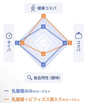 上記の図は管理栄養士の浅野まみこさんが、「健康コスパ」「コスパ」「タイパ」「食品特性」の4つの軸で、「乳酸菌のみのヨーグルト」「乳酸菌+ビフィズス菌入りのヨーグルト」を比較したもの。
