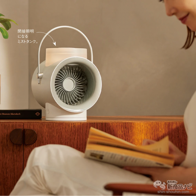 大きな特長は、水を入れて使えばミストが出て乾燥対策もできること。パワフルなファンの風にミストの気化熱がプラスされ、より快適な時間を過ごせる。しかもライト付のため、間接照明としても使えるというから便利だ。首振り機能もあるため1か所に風が当たることなく、広い範囲に風を送れるのもポイントとなっている。