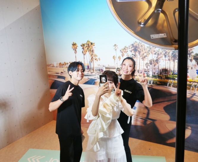この日、会場に用意されたのは、4つのシチュエーションでスマホ撮影ができるブース。さまざまなブースで、ちせさんらが『Galaxy Z Flip5』での撮影に挑みます。驚いたのは、すでにちせさんが『Galaxy Z Flip5』を使いこなしていたこと。その特徴を生かしてどんどん自撮りをしていきます。