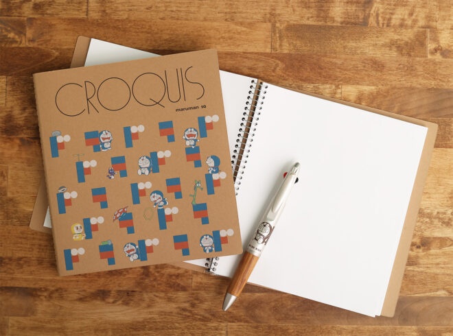 マルマンのロングセラーシリーズ「クロッキーブック」にドラえもんをデザイン。幾何学模様で「ド」「ラ」の文字が入っている中に、ドラえもん、ドラミ、ひみつ道具が紛れている楽しいデザインです。