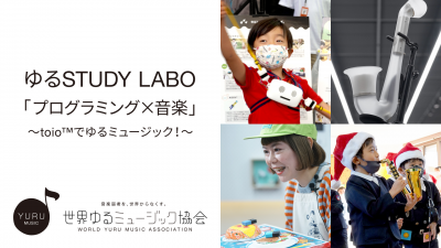 ワークショップでは「toio(TM)を使って誰にでも演奏できる『ゆる楽器』をつくろう!」と題し、誰にでも演奏できてすぐに合奏できる「ゆる楽器」をプロデュースするプログラムが開催。人気ミュージシャンDJみそしるさんとMCごはんさんが講師を務め、オリジナルのゆる楽器で音楽をつくり演奏するワークショップが行われました。