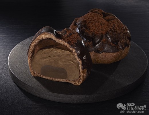 濃厚なダブルチョコクリームを味わうショコラシュー。カスタードクリームなどを使用した濃厚なビターショコラクリーム、ホイップクリーム、ベルギーチョコレート入りの生チョコレートなどを合わせたショコラクリームを、ココア風味のシュー生地で包み、生地にココアパウダーをトッピング。ビターショコラクリーム、ショコラクリームにはそれぞれ、カカオ分100%のベルギーチョコ、ブラジル・トメアスー産カカオ豆を使用したハイカカオチョコレート(カカオ分80%)を使用。