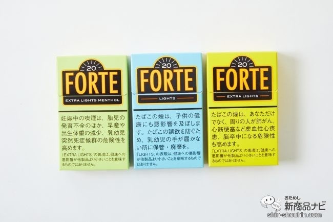 『フォルテ』シリーズにはほかに「ライト」(中央)、「エクストラライト」(右)、「エクストラライトメンソール」(左)がラインナップされている『フォルテ』シリーズは、一般的な紙巻きタバコよりもミニサイズの長さ70ミリ。短時間でサクッと吸えて、しかも吸いごたえバツグン。価格もワンコイン(500円)でお釣りが来るというコストパフォーマンスの高いタバコとなっている。